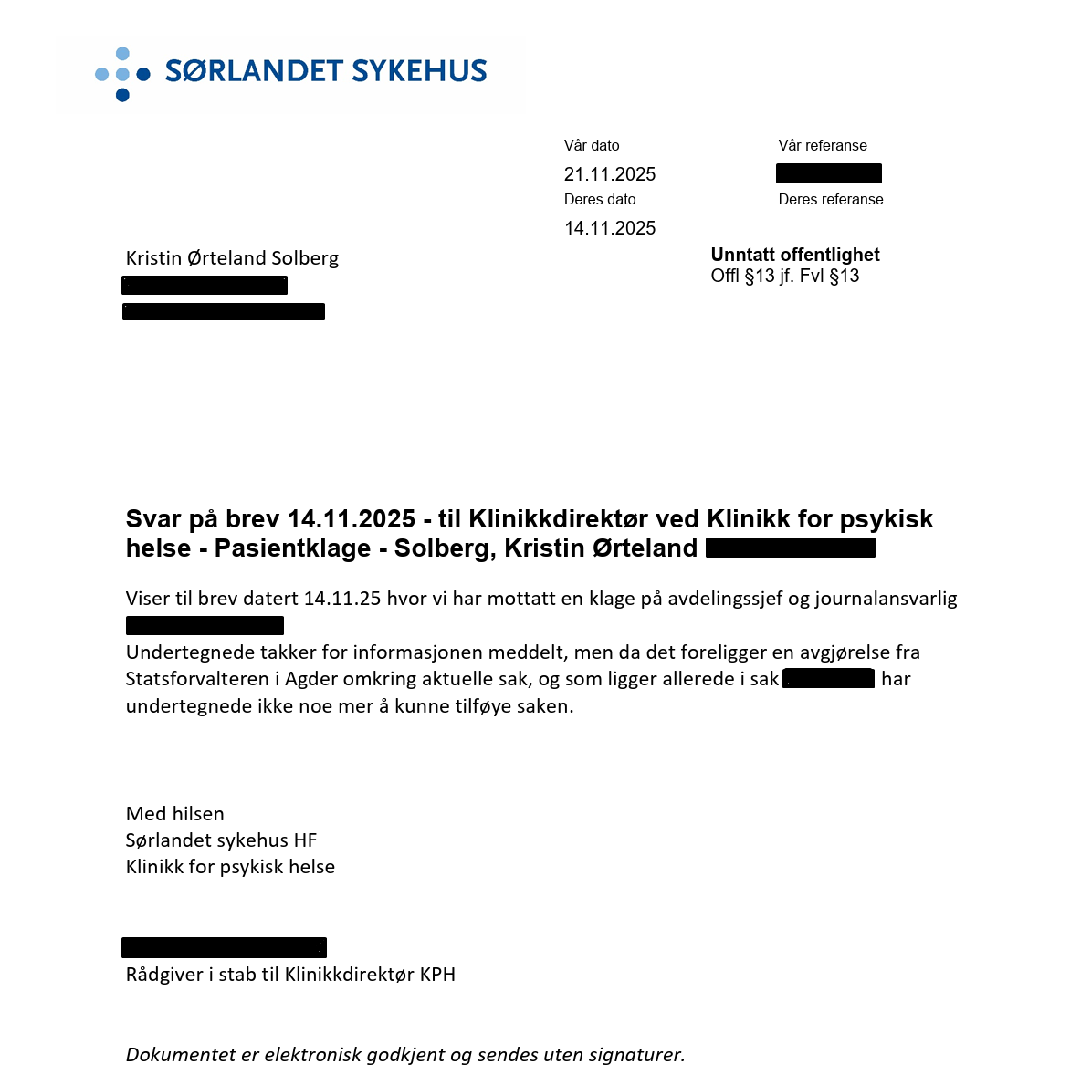 2025.11.21_Sørlandet_Sykehus_HF_Svar_pa_brev_14.11.2025_-_til_Klinikkdirektør_ved_Klinikk_for_psykisk_helse_-_Pasientklage_-_Solb…_Skjult innhold