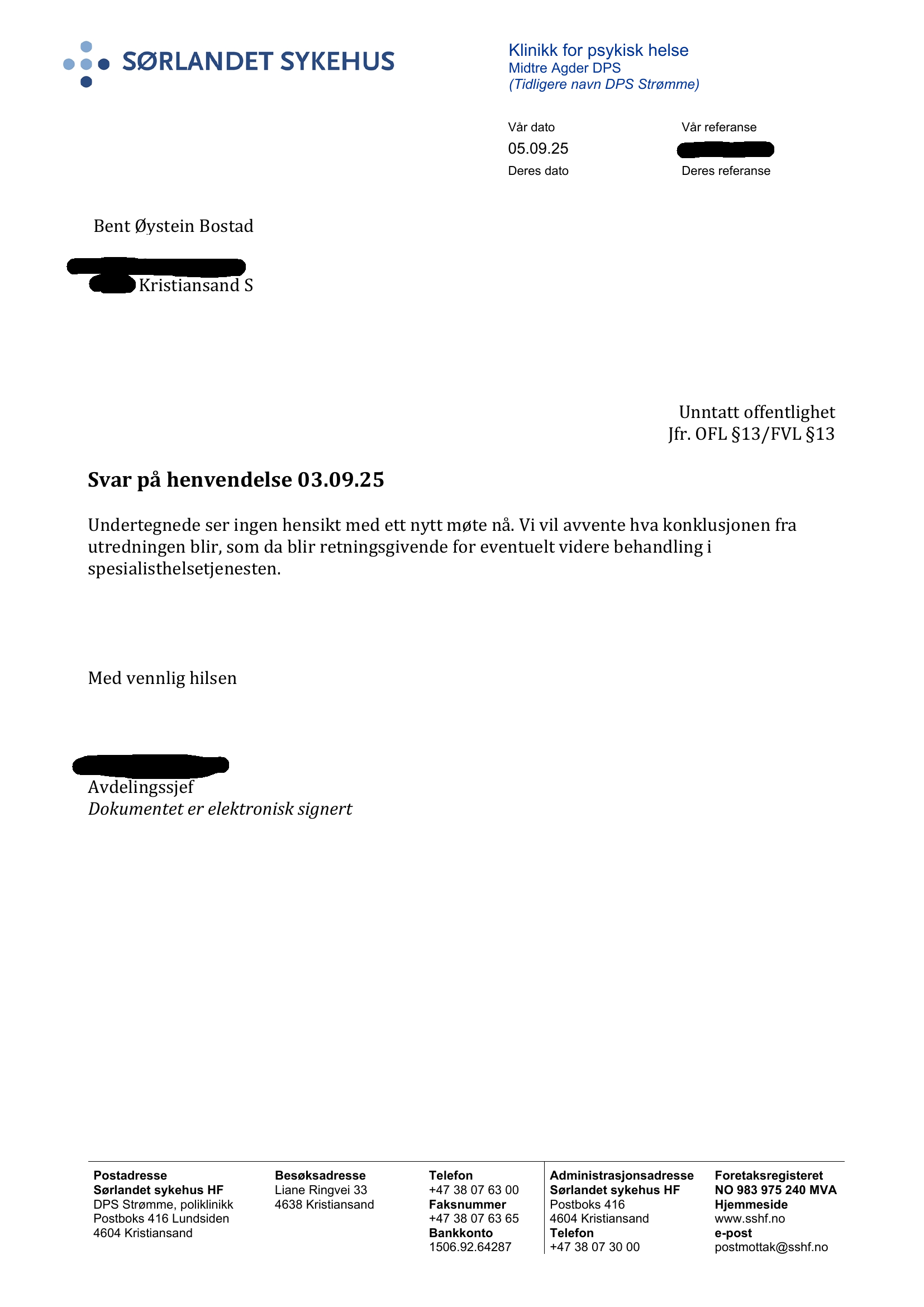 Det kan vel ikke bli kortere og mer avvisende enn dette som svar på henvendelsen fra pårørende 01.09.25. Beklagelsene som kom i møtet 25.08.25 på hvordan pårørende var blitt behandlet kan jo se mer ut som tomme ord når avdelingssjefen svarer som dette.