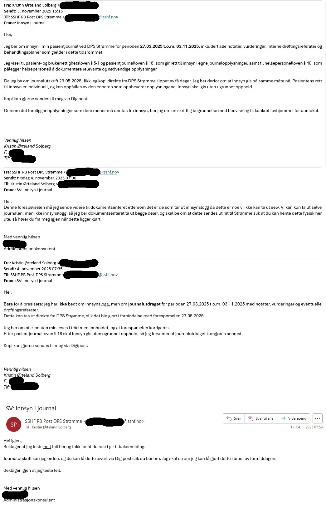 I tillegg er dette ikke en tilfeldig eller bagatellmessig forespørsel: etter helsepersonelloven §§ 39 og 40 pliktet DPS å journalføre alle relevante vurderinger, inkludert endringer i diagnosebildet og nye diagnostiske vurderinger. Dersom diagnoser er endret uten at det finnes en journalført faglig vurdering, er det et brudd på journalføringsplikten – og i praksis også et brudd på forsvarlighetskravet i helsepersonelloven § 4.