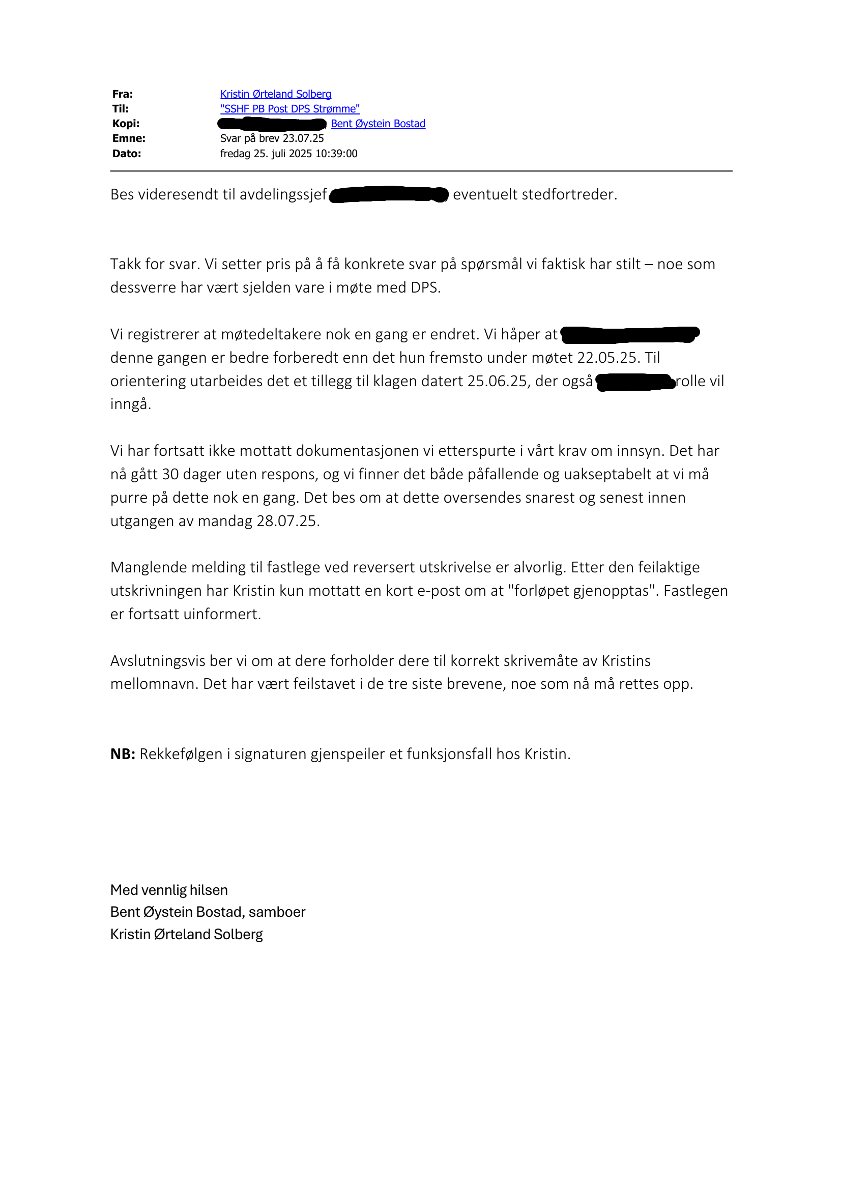 Vi påpeker likevel flere alvorlige forhold: manglende dokumentasjon til tross for innsynskrav og at fastlegen fortsatt ikke er informert etter den feilaktige utskrivelsen.
