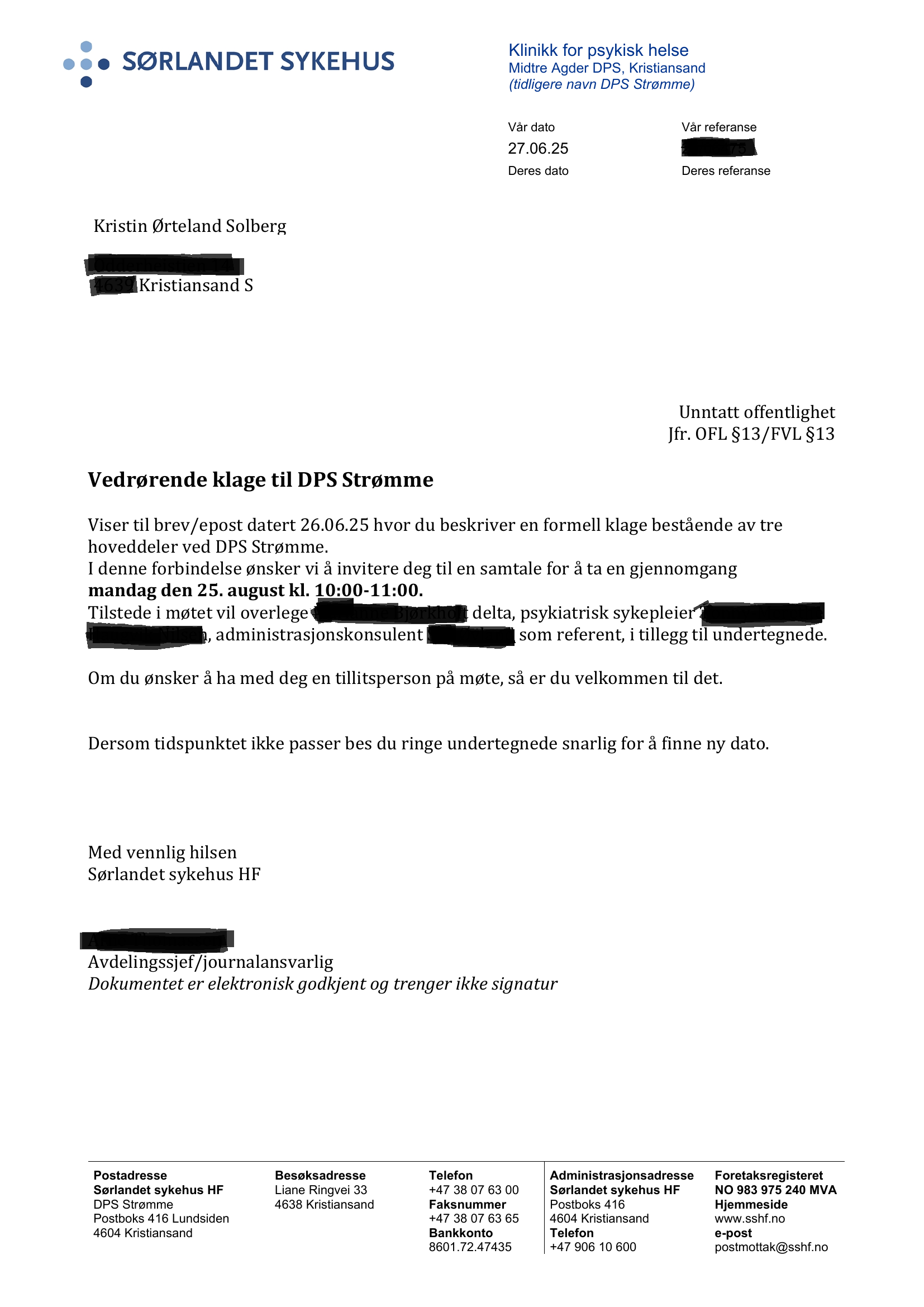 Jeg får innkalling til møte – først om to måneder. Det sier sitt om tempoet i oppfølgingen, spesielt med tanke på alt som har skjedd, og alle feilene jeg allerede har påpekt.