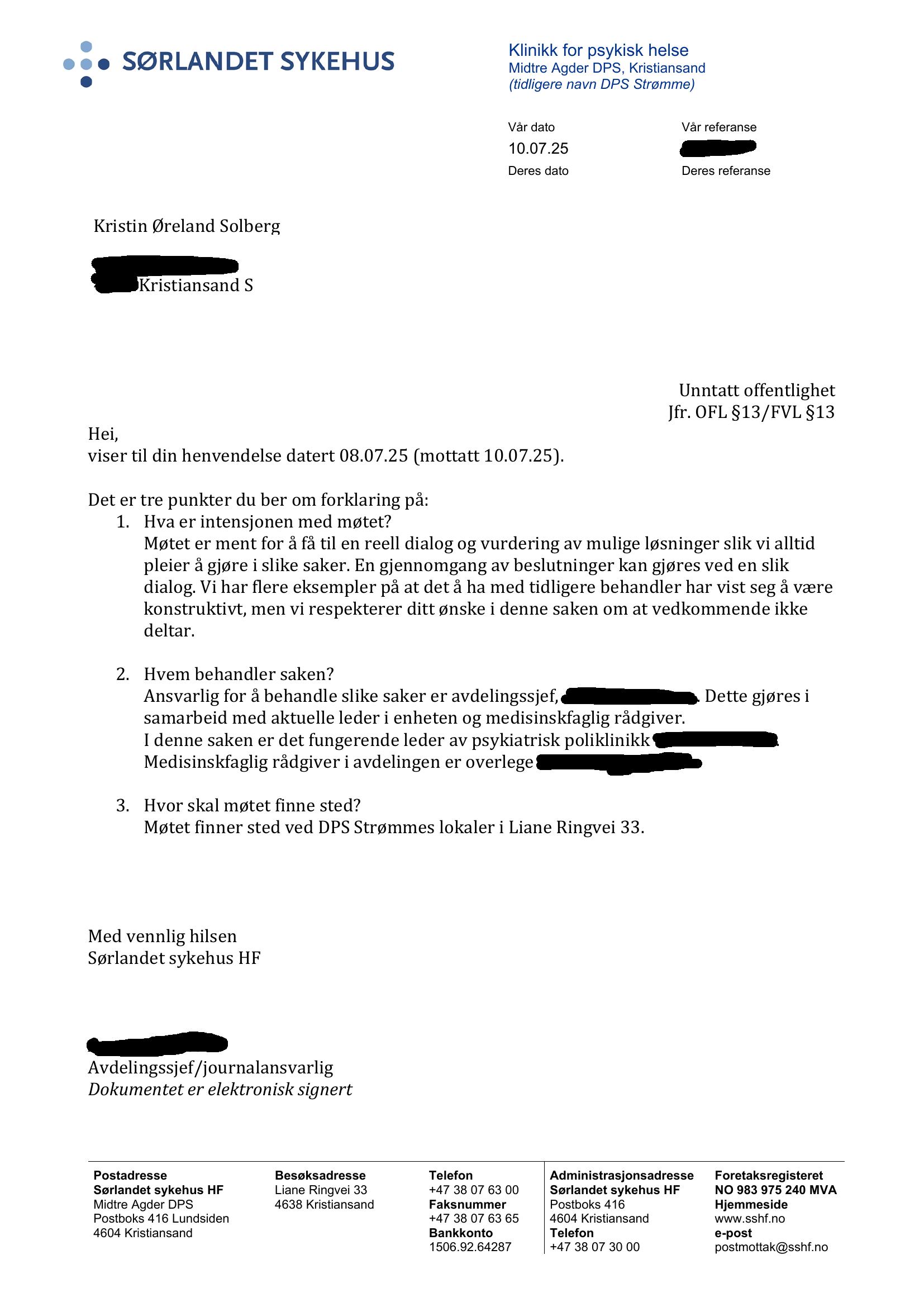 De gir nå en mer konkret forklaring på hva møtet skal handle om, hvem som behandler saken, og hvor det skal holdes. Selv om svarene er mer detaljerte enn tidligere, oppleves de fortsatt generelle og lite forpliktende.