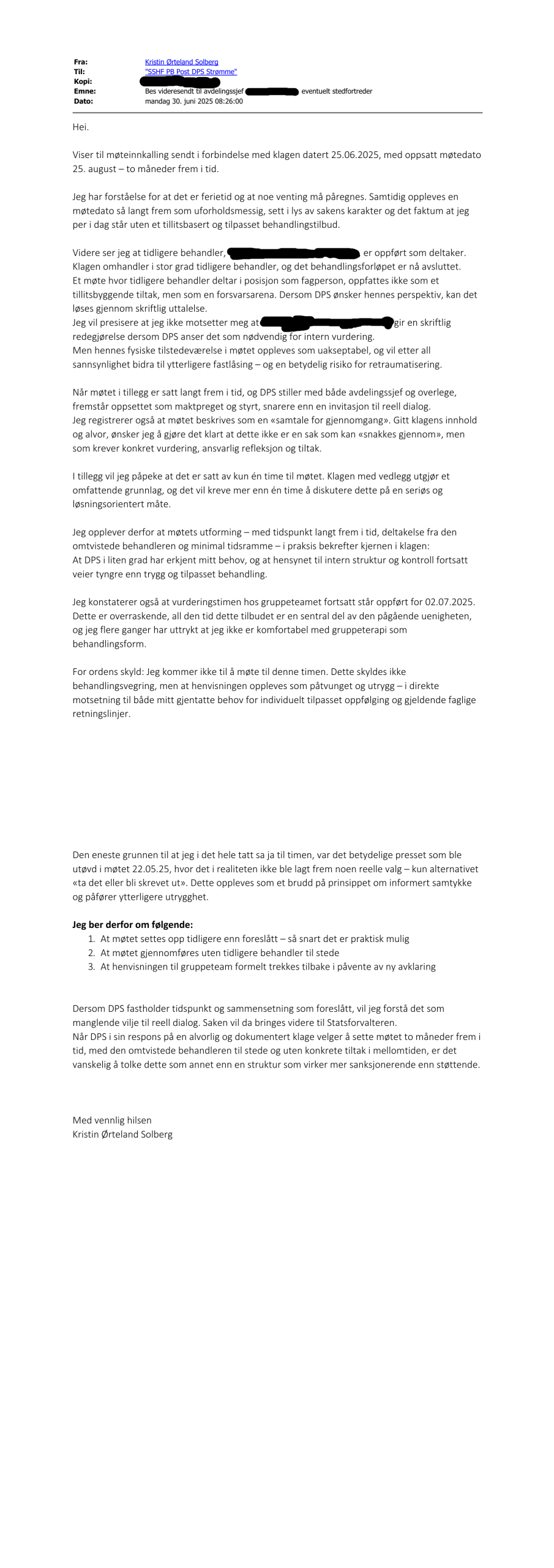 Oppsettet fremstår ikke som et forsøk på trygg og konstruktiv dialog, men som et maktpreget og styrt møte. Det burde være åpenbart for DPS at det ikke er ønskelig – eller forsvarlig – at den samme behandleren som står i sentrum av klagen, skal delta som fagperson i et møte som angivelig skal handle om veien videre.