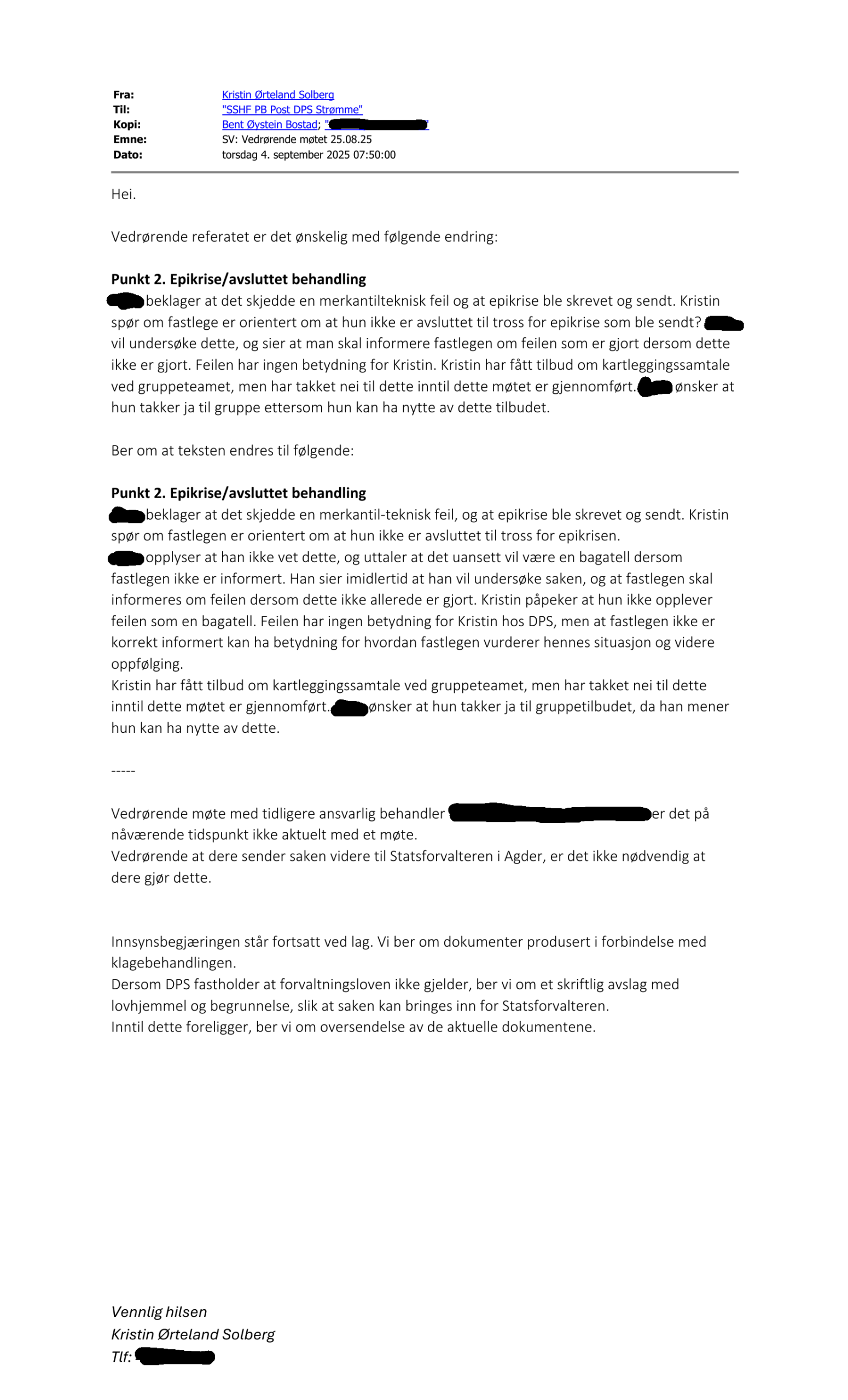 Jeg sender inn forslag til endringer i referatet etter møtet. Jeg opplever ikke at avdelingssjefen tar alvoret i at fastlegen min fortsatt ikke er informert om den feilaktige utskrivelsen, til tross for at dette kan få direkte konsekvenser for videre oppfølging og behandling.