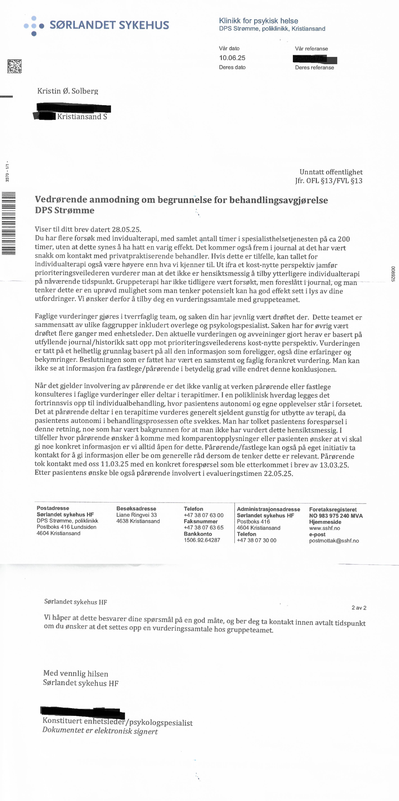 Svaret fremstår langt og formelt, men unngår likevel å svare konkret på punktene jeg ba om. Det gis ingen tydelig redegjørelse for hvem som deltok i beslutningen, hvilke faglige vurderinger som faktisk ligger til grunn, eller hvorfor involvering av fastlege og pårørende fortsatt vurderes som «unødvendig». Dette er informasjon jeg har rett på etter pasient- og brukerrettighetsloven § 3-2 og forvaltningsloven §§ 24–25, men som DPS likevel unnlater å gi.