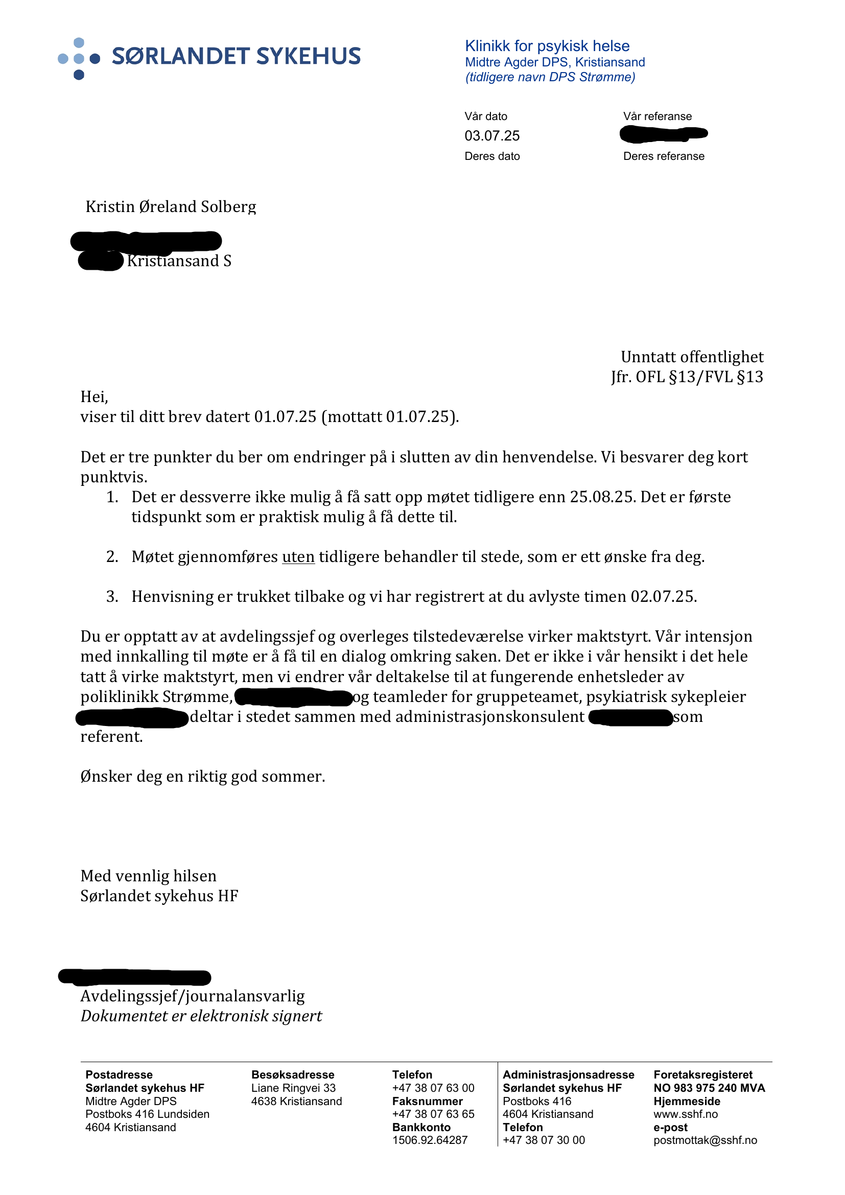 DPS svarer raskt og etterkommer ønsket om at behandler ikke skal delta. De gjør også enkelte endringer i hvem som ellers skal delta i møtet. Møtetidspunktet står imidlertid fast – fortsatt to måneder frem i tid.